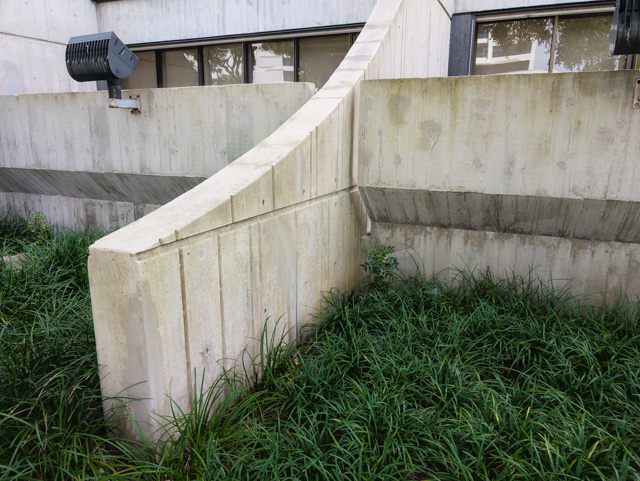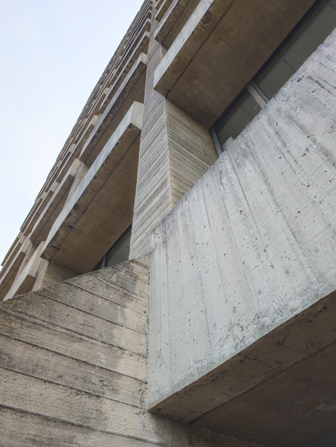 The university asked that Netsch make use of the same local limestone as the historic buildings of the main university quad, so what appears to be raw concrete is actually massive slabs of cut limestone. Looks cool!